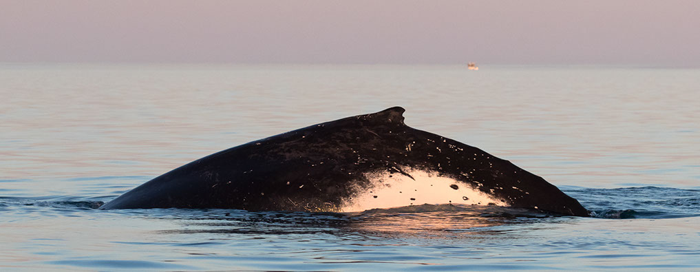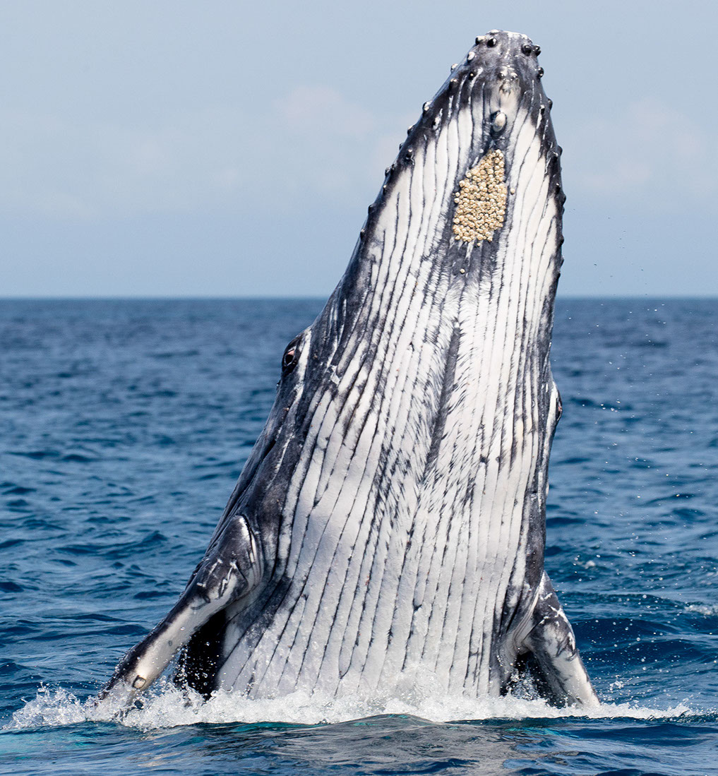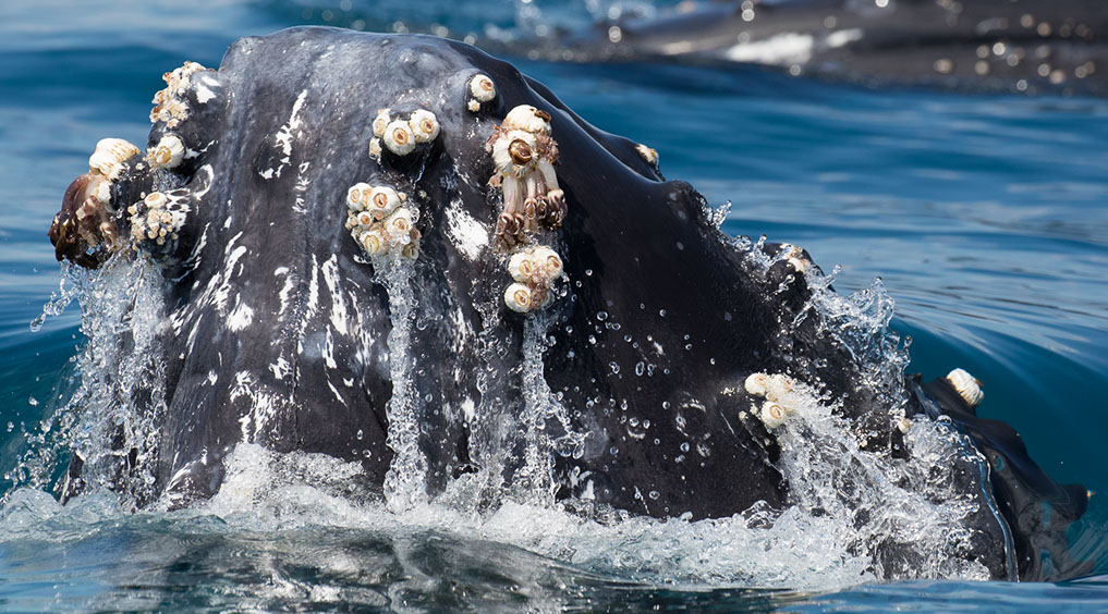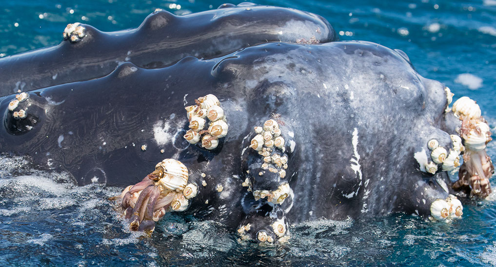A close approach by this curious whale clearly shows fleshy goose neck barnacles growing on the circular acorn barnacles.